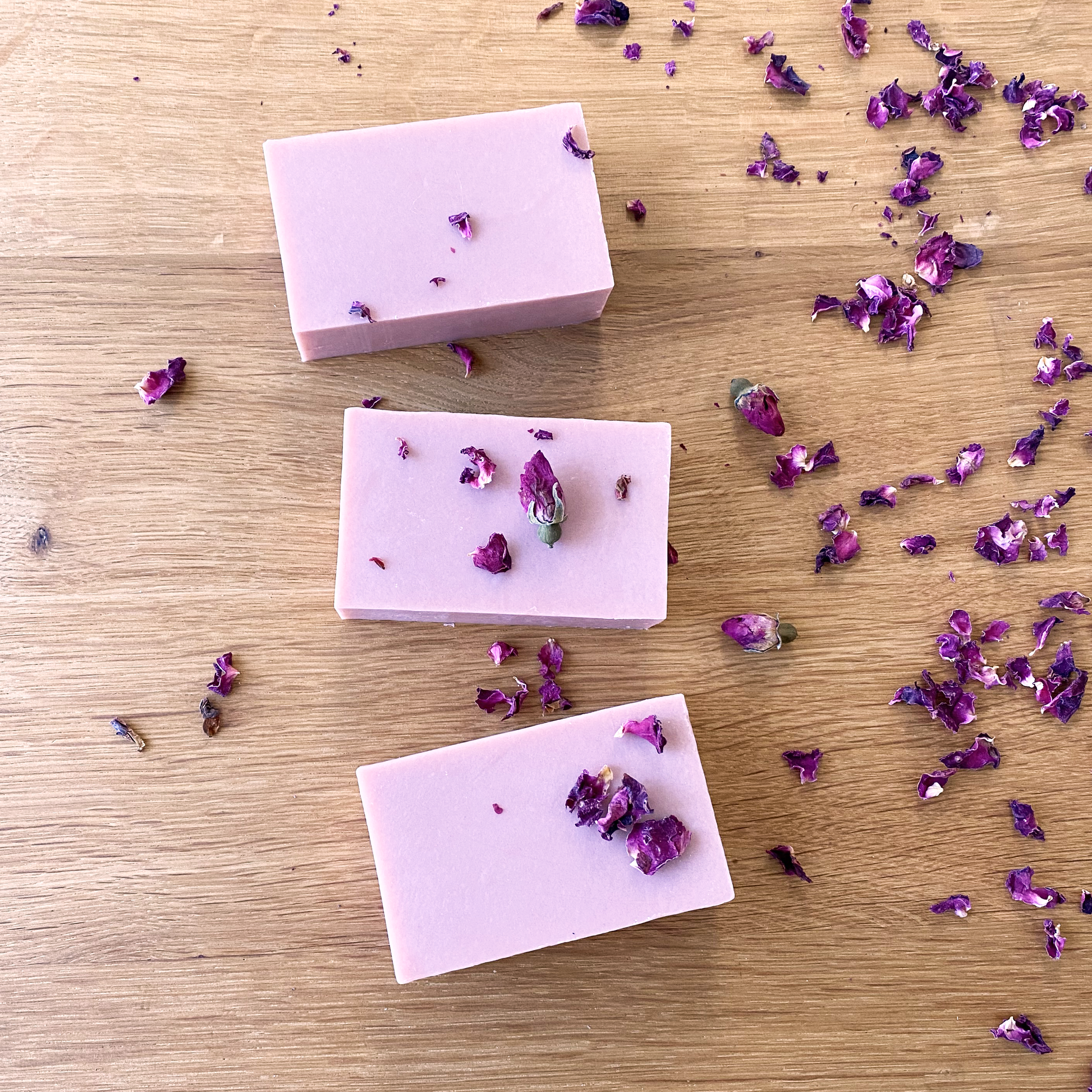 The soap is scented with an all-natural Rose geranium, Palmarosa and Lavender essential oil blend to create a floral, rosy, sweet, and fresh aroma.